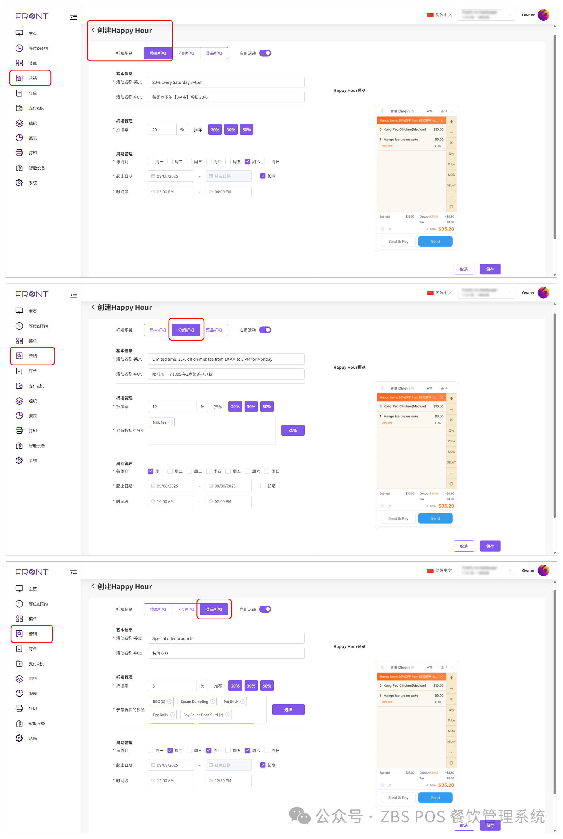 刚到店时,服务员就热情地告知,现在通过系统设置了周末 Happy Hour 活动,晚上 7 点到 9 点,指定的烤串系列都有 8 折优惠,像那道招牌的菠萝牛肉串就在其中。酸甜的菠萝裹挟着鲜嫩的牛肉,烤得滋滋冒油,一口下去,果香与肉香在口中交织,简直是味蕾的盛宴。后来才了解到,这套系统的 Happy Hour 功能特别灵活,店家可以根据自己的需求,自由选择是整单折扣、指定分组折扣还是指定菜品折扣,活动时间也能精确到日期和具体时段,还能设置每周循环,像节日促销、临时想搞波活动都能轻松应对,后台随时能调整,特别方便。